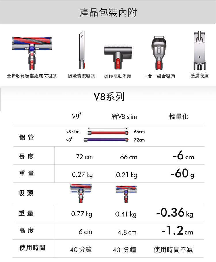 內附:軟質碳纖維吸頭/迷你電動吸頭/二合一組合吸頭/隙縫吸頭/可拆式硬管/電池/充電器/充電壁掛底座