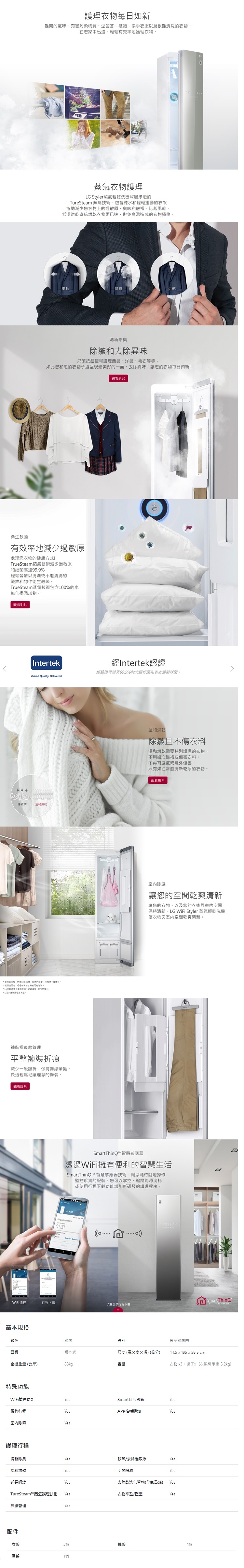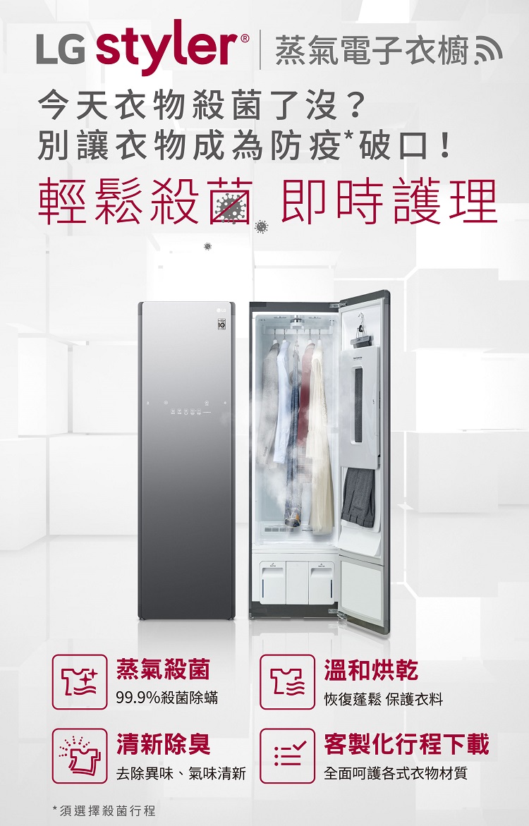 此商品客訂出貨※ 衣物平整/去皺/塑型/清新除臭※ 蒸氣殺菌/殺死99.9%大腸桿菌&金黃色葡萄球菌 ※ 英國過敏協會BAF認證/ 高級烘乾(輕柔烘乾) ※ NFC Tag On雲端客製行程 ※ 智慧變頻壓縮機 ※ WiFi遠控/ 室內除濕 |