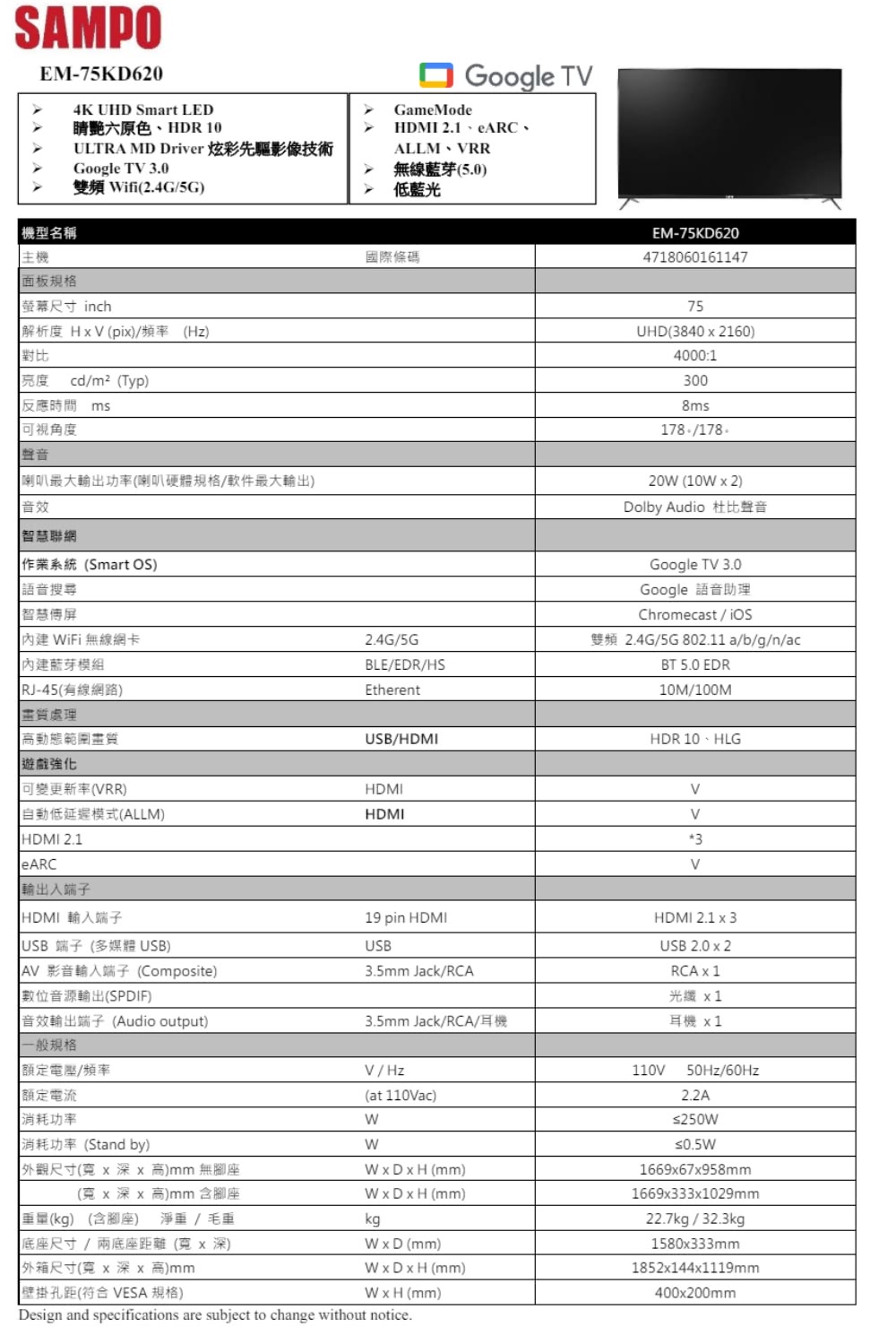 | SAMPO聲寶 75型 連網智慧顯示器 EM-75KD620 含基本安裝 |
