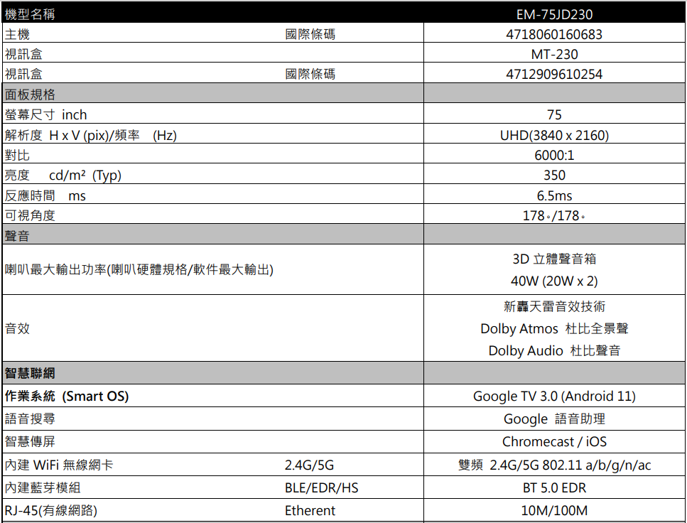 SAMPO 聲寶 75吋 Android 11 4K聯網新轟天雷顯示器EM-75JD230 含基本安裝